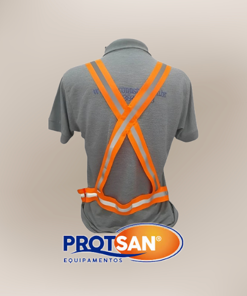 Colete de sinalização laranja fluorescente com faixas refletivas para alta visibilidade. Leve e prático para trabalho em ambientes de risco.