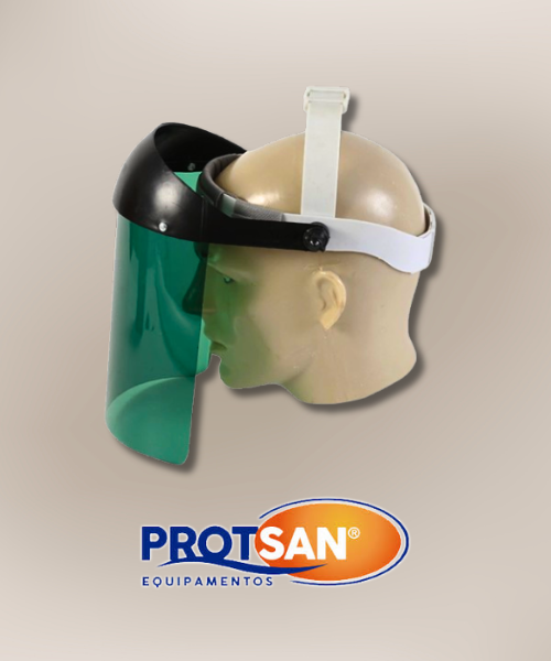 Protetor facial com visor em policarbonato que protege olhos e rosto contra impactos, radiação UV e luz intensa. Confortável e ajustável para uso prolongado.