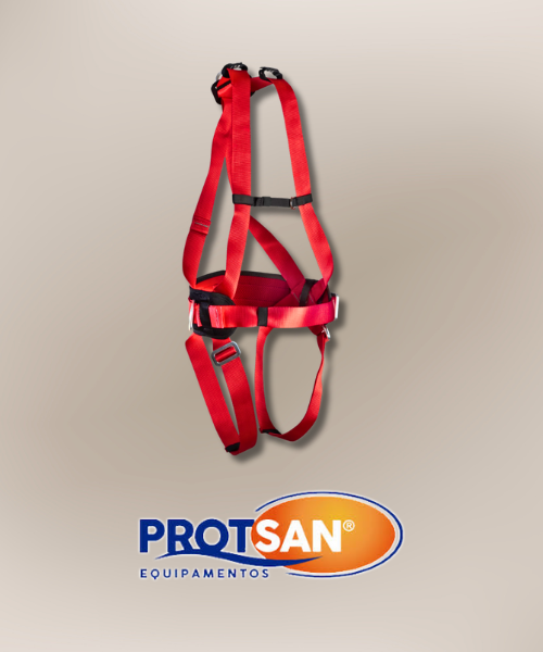 Cinturão de segurança tipo paraquedista/abdominal, confeccionado em fitas de 45mm (primárias) e 25mm (secundárias) de poliéster. Regulagem nas pernas com fivelas em aço e fechamento peitoral em fivelas plásticas.
